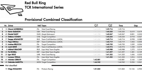 Джанни Морбиделли стал лучшим в квалификации серии TCR на австрийской трассе «Ред Булл Ринг». Второе место — у Кевина Глисона. Третьим стал Даниэль Наджи.